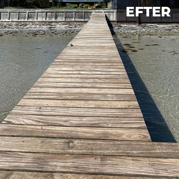 Dernæst foretager vi den dybdegående hedvandsafrensning af din træterrasse. Vi sørger for, at støv, snavs, alger, mos og andet, der måtte genere træterrassens æstetiske udtryk, bliver fjernet, så træterrassen bliver super flot. På den måde opnår vi det flotteste naturlige udtryk.
