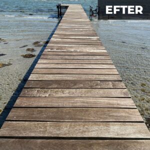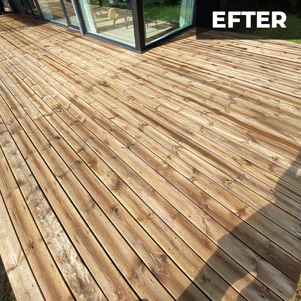 Efter træterrassen er renset, sæbebehandler vi hele området. Desinficeringen sikre at hvis du skulle ønske at oliebehandle eller male træterrassen efter rensning, at overfladen er helt ren og fri for biologiske rester, så efterbehandlingen holder længere. Selvom rensning fjerner synligt snavs og belægninger, kan der stadig være mikroskopiske svampe- og algesporer tilbage i træets overflade. Desinfektion hjælper med at dræbe disse og forhindrer hurtig genopblomstring.