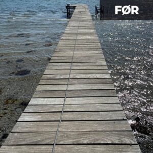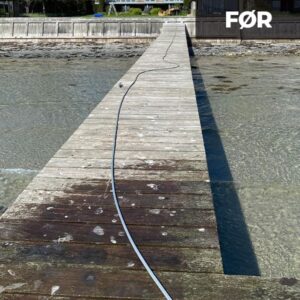 Vi starter med at påføre træterrassen et opløsningsmiddel, som blødgøre vækste og skidt, så vi kan rense træterrassen med lavt tryk, og herunder også så skånsomt som muligt.